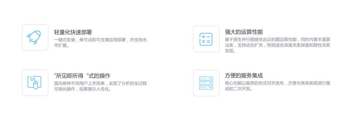 基于知识图谱手艺提供知识接入、知识盘算、知识推理以及知识可视化能力,,,,,,通过面向效劳的平台架构、图盘算引擎、交互式语义剖析、大规模数据处置惩罚,,,,,,富厚的图挖掘和路径妄想算法,,,,,,助力知识驱动智能。。。