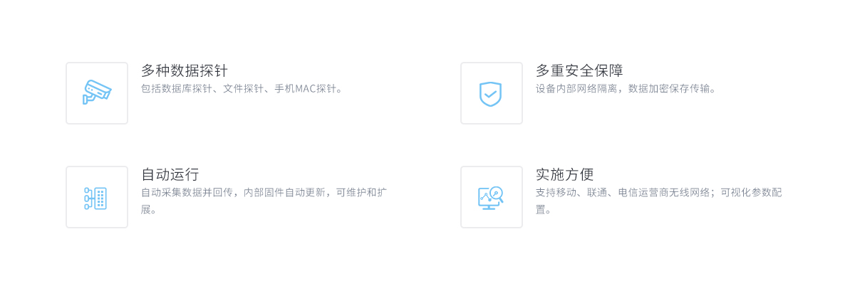 平安都会无线智能感知终端对离散、脱网的社碰面数据的实时收罗,,,如停车场、小区物业、旅游景点、访客挂号等场合。。。。。。。产品具有数据库探针、文件探针、手机特征信息探针、位置探针功效。。。。。。。