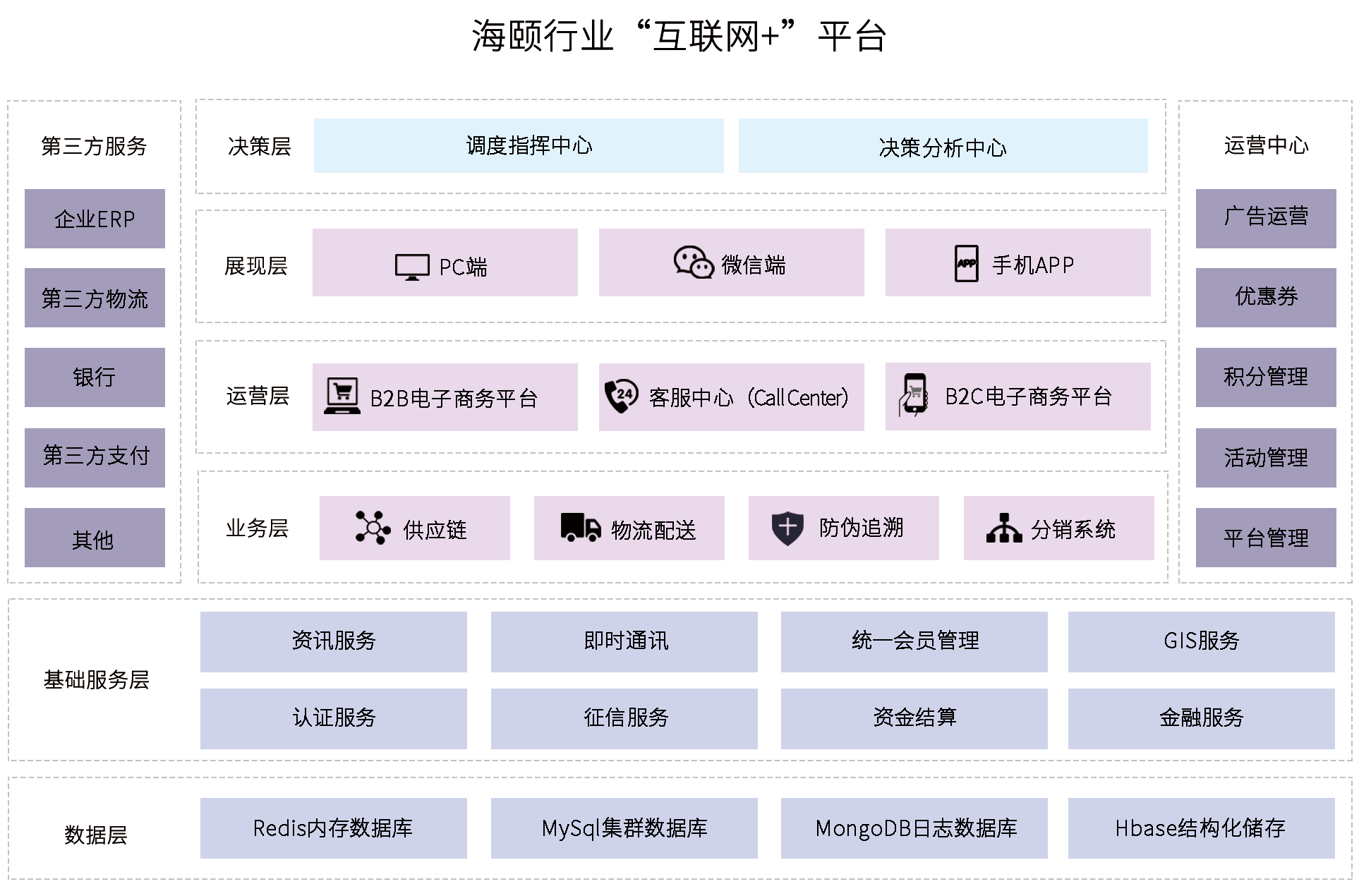尊龙凯时“行业互联网+”平台是古板工业借力大数据、云盘算、智能终端以及网络通讯手艺优势,, ,,,,提升内部效率和对外效劳能力,, ,,,,以修建工业信用链作为立异工程,, ,,,,整合供应链上下游企业,, ,,,,全力打造的以产品、效劳、营销等方面实现资源共享的综合效劳平台。。。。。。。平台面向效劳形成标准化组件,, ,,,,现已完善出数十个基础效劳平台:认证效劳、电子条约会签、数据交流、征信效劳、会员治理、资金结算、资讯效劳、活动推广、即时通讯、大数据效劳等。。。。。。;; ;谝陨献榧和效劳行业“互联网+”逐渐形成大宗现货生意(B2B)平台、中小企业分销(B2C)平台、智慧物业治理平台三条焦点产品线。。。。。。。 平台将提升用户体验、专注极致、平台共享的互联网头脑融入古板IT效劳链,, ,,,,面向互联网特点和应用需求举行设计开发,, ,,,,增进了供应链、智慧物流、互联网金融、移动社交、GIS地图、广告运营、资讯效劳等新营业的融合,, ,,,,使平台能对市场需求做出快速精准的反应,, ,,,,同时助力企业赢得更大的生长空间。。。。。。。