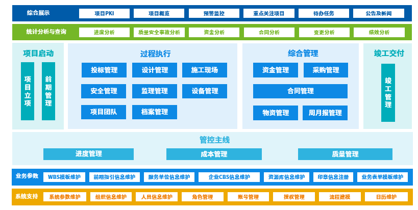 按策划和决议、立项准备、项目实验到完工交付四个阶段对工程项目举行全历程治理,,,,,,实现对项目概预算、进度、物资、质量、条约、本钱、分包、机械装备、文档等营业的全笼罩和全管控,,,,,,并通过对各环节的资源整合,,,,,,实现营业流、信息流、资金流、物流、控制流的统一。。。。。。。
