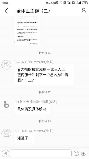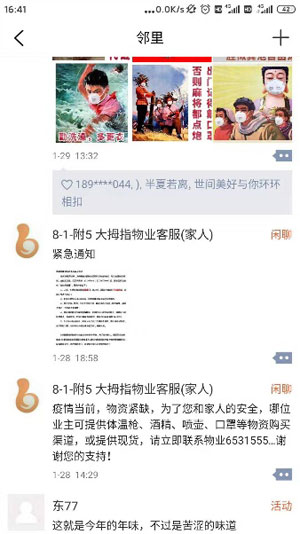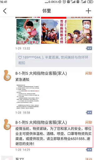 疫情眼前,,,,天天各人通过邻里圈、邻聊相同生涯、事情、防疫步伐,,,,业主们真正体会到了守护在自己家园的物业人的支付与真诚。。。。。。。当看到软件邻里圈中,,,,物业员工发出物资欠缺的求援后,,,,自行组织将自己的防护物资提供到物业人手中,,,,助力疫情防控事情。。。。。。。一张口罩、一把体温枪、一瓶消毒水就是物业抵御病毒的所有武器。。。。。。。4号楼2单位1503的业主听闻后,,,,给我们送来了100枚口罩,,,,3号楼2单位703的业主送来消毒液、1号楼赵姨妈和4号楼的陈姨妈天天带着红袖标义务帮我们门岗执勤......物业人也被感动着,,,,更有斗志投入到这场无声的硝烟中。。。。。。。邻里圈里随处是分享、是感动,,,,是爱心、是相助......