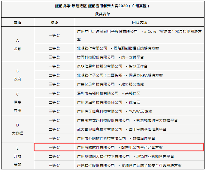 2020年8月21日,,,,,,,鲲鹏应用立异大赛广州赛区总决赛在广州东圃合景福朋喜来登旅馆准期举行,,,,,,,经由强烈的角逐,,,,,,,尊龙凯时软件携参赛作品“配售电公司生产谋齐整体化平台”荣获广州赛区总决赛“开放命题”组一等奖。。。。