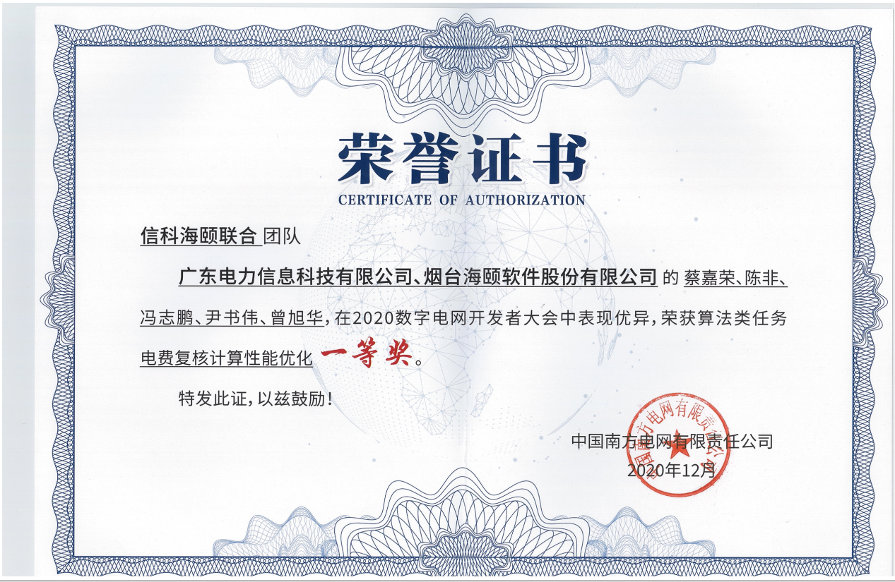 2020年12月,,,,尊龙凯时软件在中国南方电网有限责任公司举行的“数字电网开发者大会”算法类角逐“电费复核盘算性能优化”中获得了预赛第一、决赛第一的好效果,,,,展现了公司在电费复核营业与大数据手艺方面的优势。。。。。。